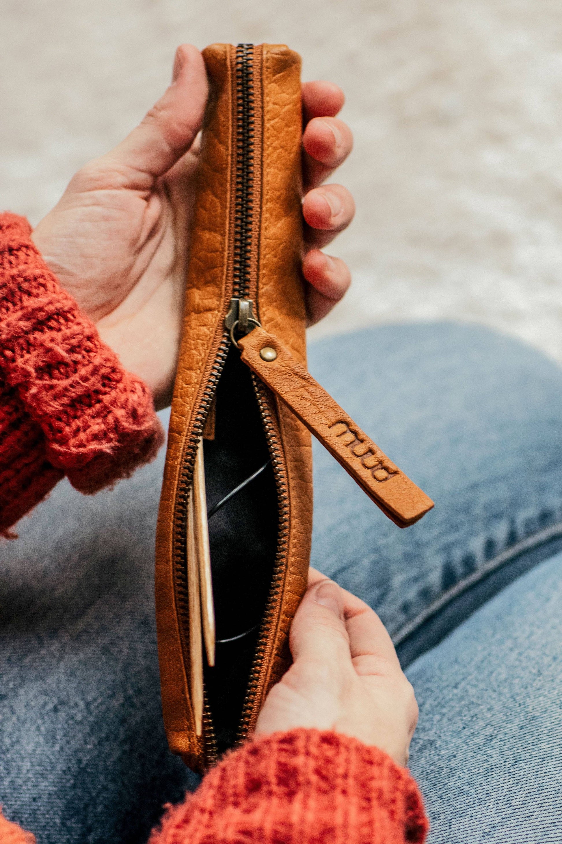 Handmade leather case Hee XL from muud is a beautiful pencil case in genuine leather designed to hold and organise your crochet and knitting accessories. The pencil case is made by hand in genuine leather that will age with beauty. Thanks to the slim design, the Hee pencil case will fit in your everyday project bag allowing you to bring your essentials everywhere you go.